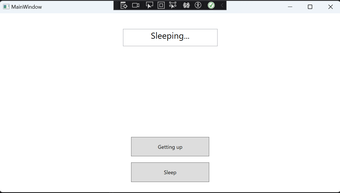 最初に配置していたButtonのContentを”Getting up”に、先ほど配置したButtonのContentを”Sleep”に変更した後、SleepのButtonをダブルクリックしてMainWindow.xaml.cs側にButtonをクリックした際に行う処理を追加させます。